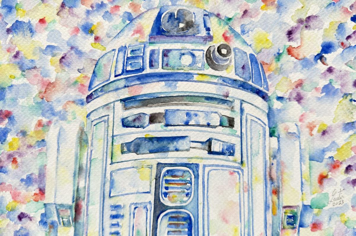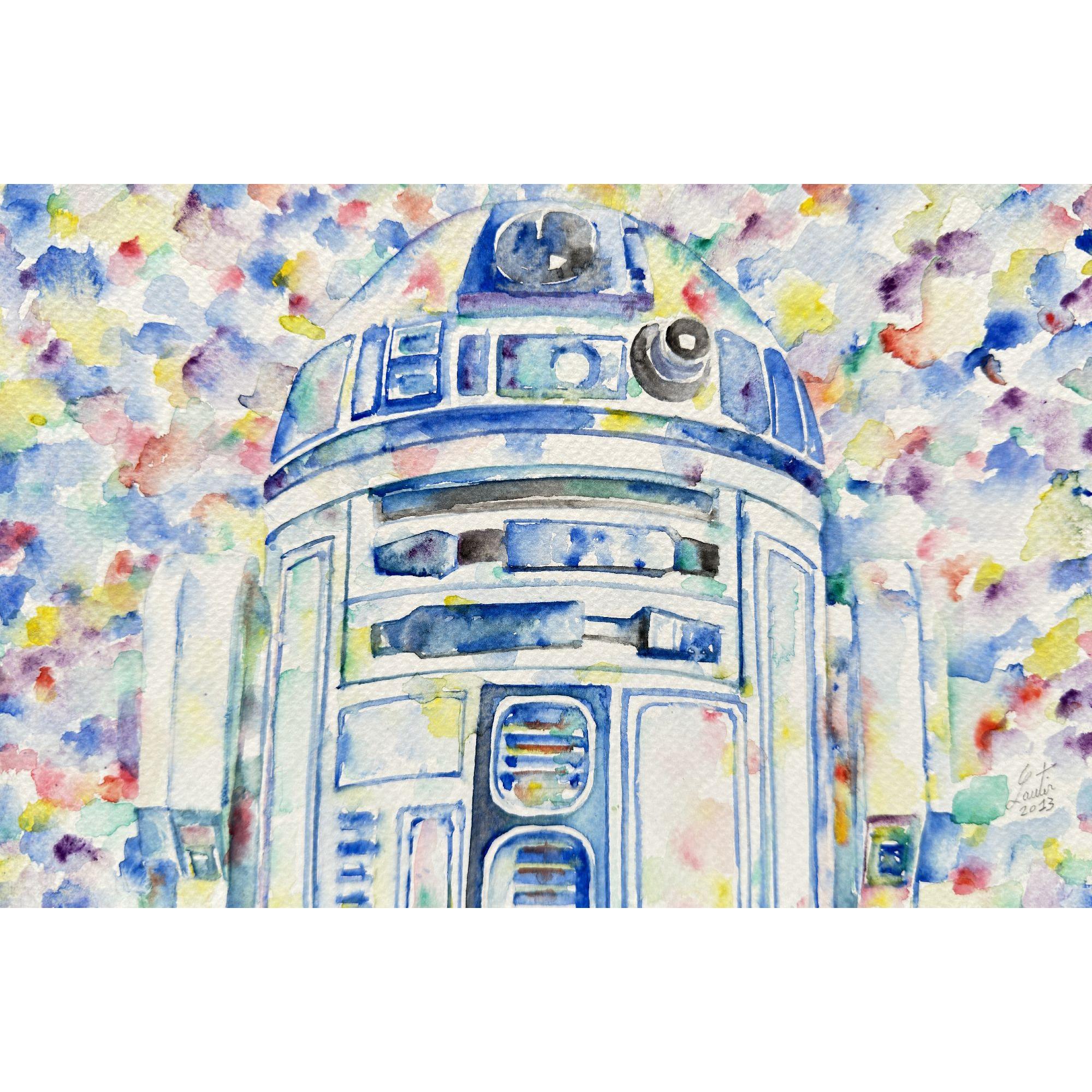 Questo è un affascinante ritratto ad acquerello di R2-D2, l'iconico droide di Star Wars. Il tocco delicato dell'artista con gli acquerelli dà vita a questo amato personaggio su carta. L'opera è firmata e datata (LAUTIR 2013) in basso a destra, a garanzia della sua autenticità.