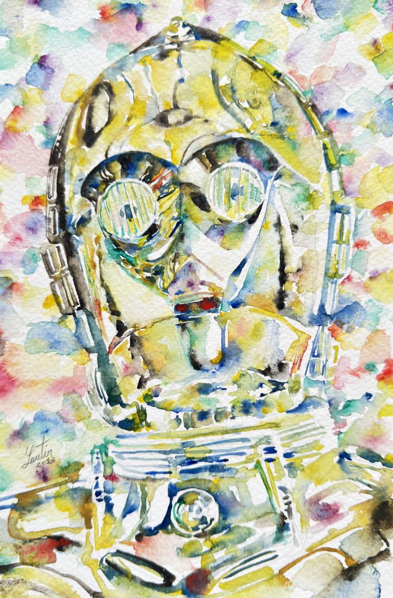 L'artista ha catturato l'essenza di C-3PO con delicate pennellate e un occhio attento ai dettagli. La scelta dell'acquerello conferisce all'opera una qualità morbida ed eterea, evidenziando la forma metallica del personaggio con sfumature sfumate. L'opera è una testimonianza del fascino intramontabile di Star Wars e dei suoi personaggi memorabili.