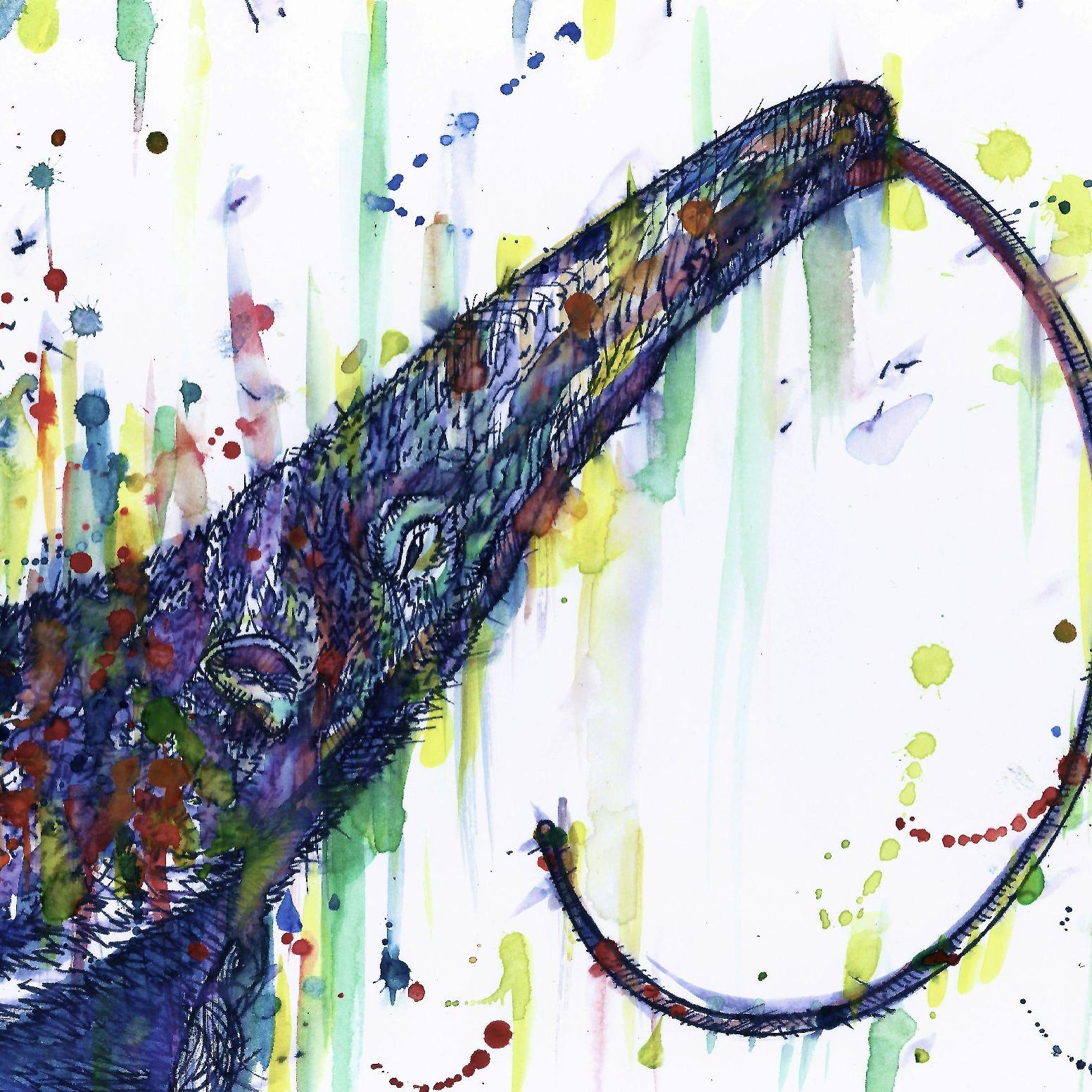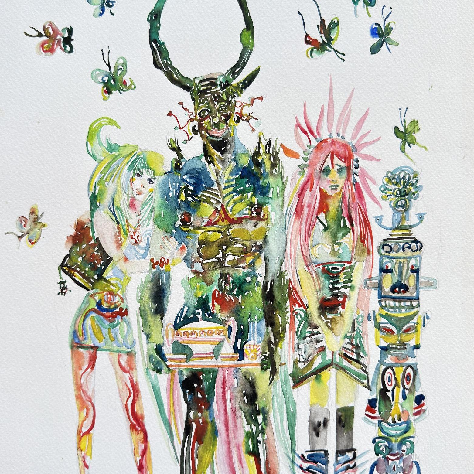 DEMONE CON TRE CORNA CON VASSOIO DA TÈ, DUE RAGAZZE, NOVE FARFALLE E UN TOTEM
